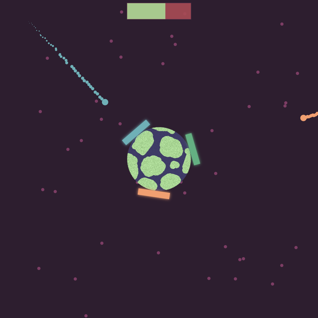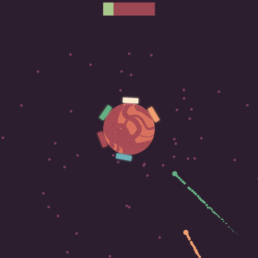 Use 'A' and 'D' to rotate the shields around the planet. The difficulty will increase as you successfully block comets, and your planet will get destroyed as comets impact it.